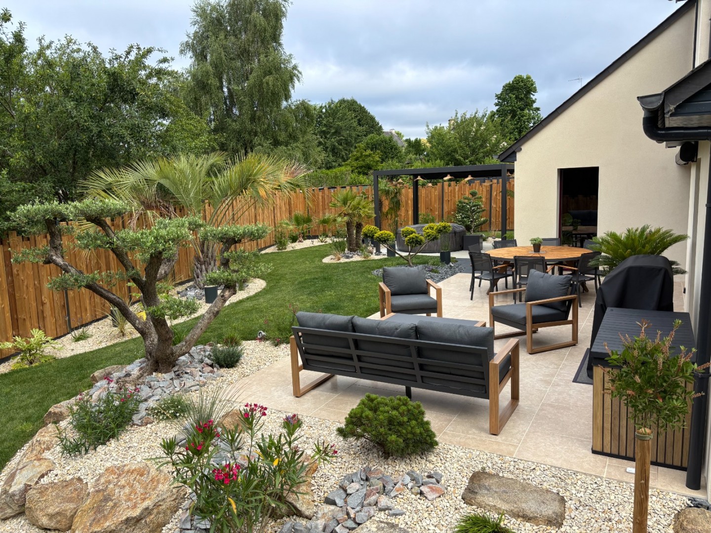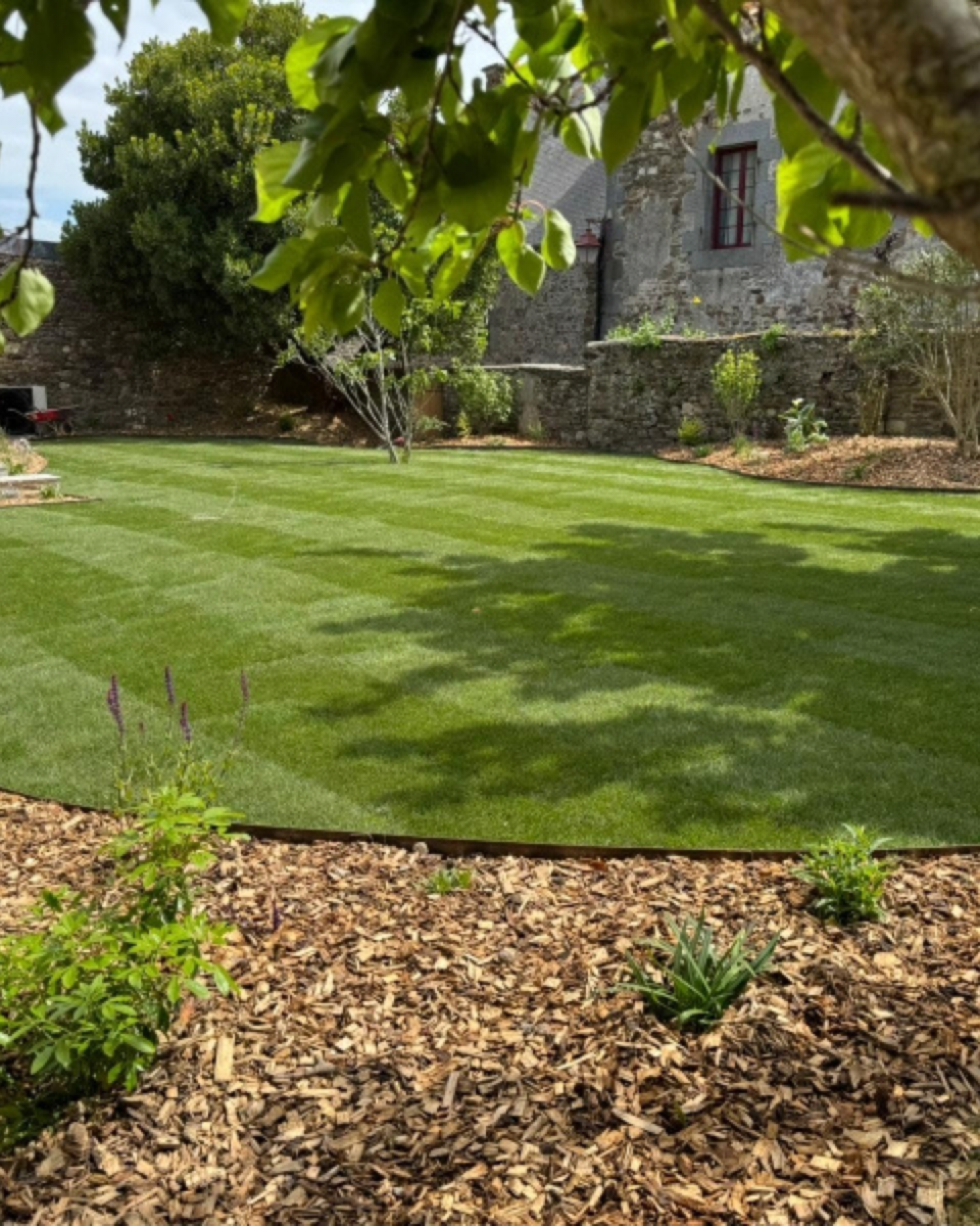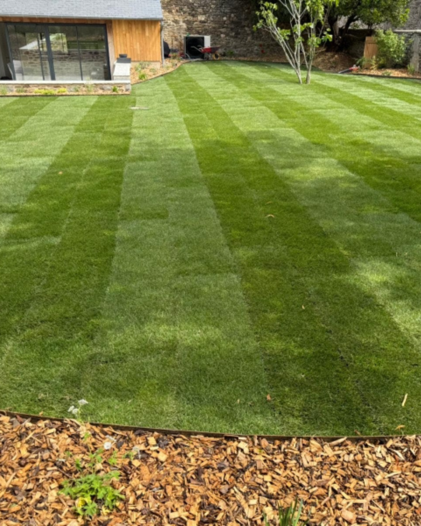 La majorité des photos sont prises le jour de la pose du gazon en rouleau, vous pouvez apercevoir les lés de pelouse naturel qui ne seront plus visible après 3 semaines.